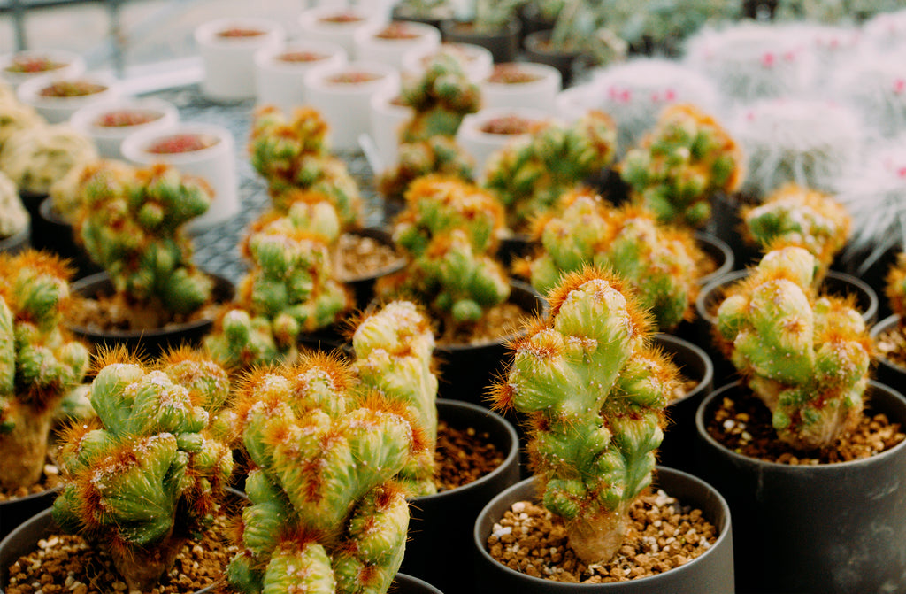 園芸の世界では珍品とされる変異種ですが、MOLLISではサボテンやユーフォルビア属の綴化*や、モンストローサ**をセレクトして育苗しています。