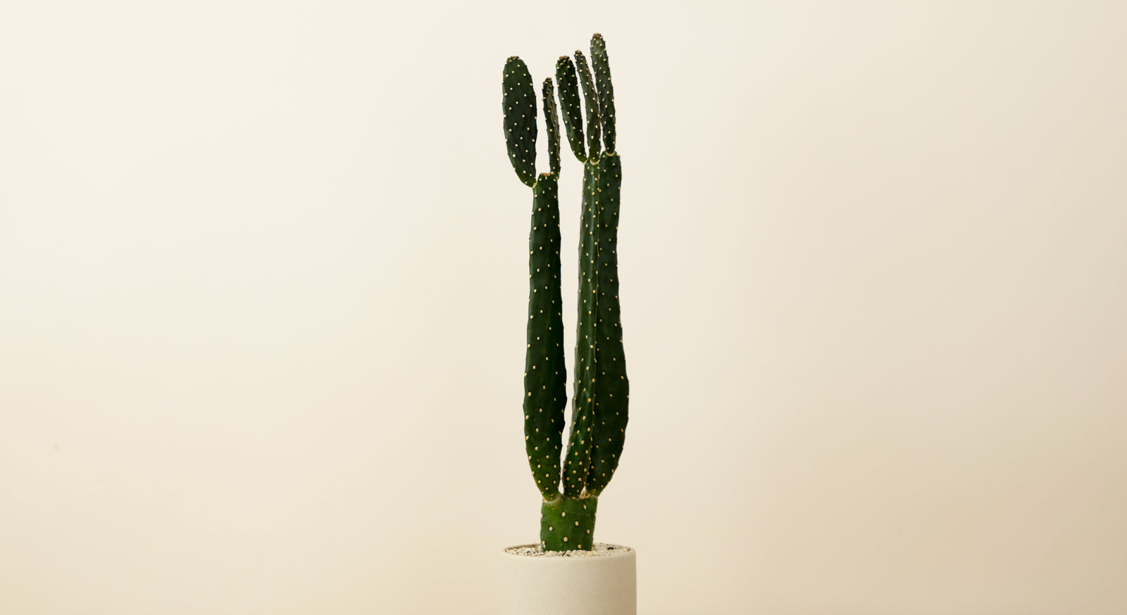 バンザイをしているようなシルエットが愛らしいサボテン。しっかり日光に当たると、表面が味わいのある黒みがかった色になり、切り口から扁平な子株が伸びていく変化を愉しむことができます。子株はとれやすいのでご注意ください。