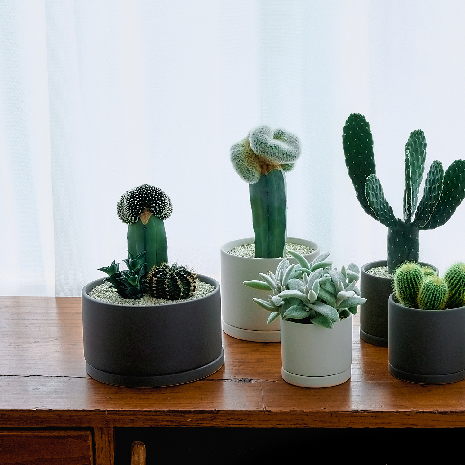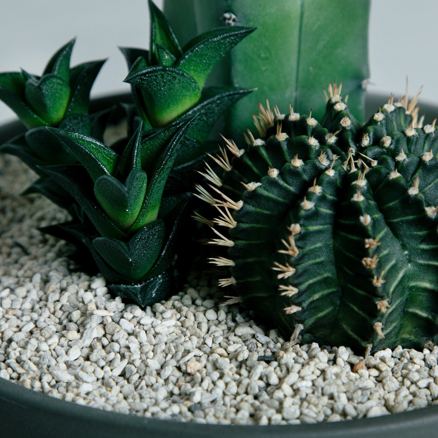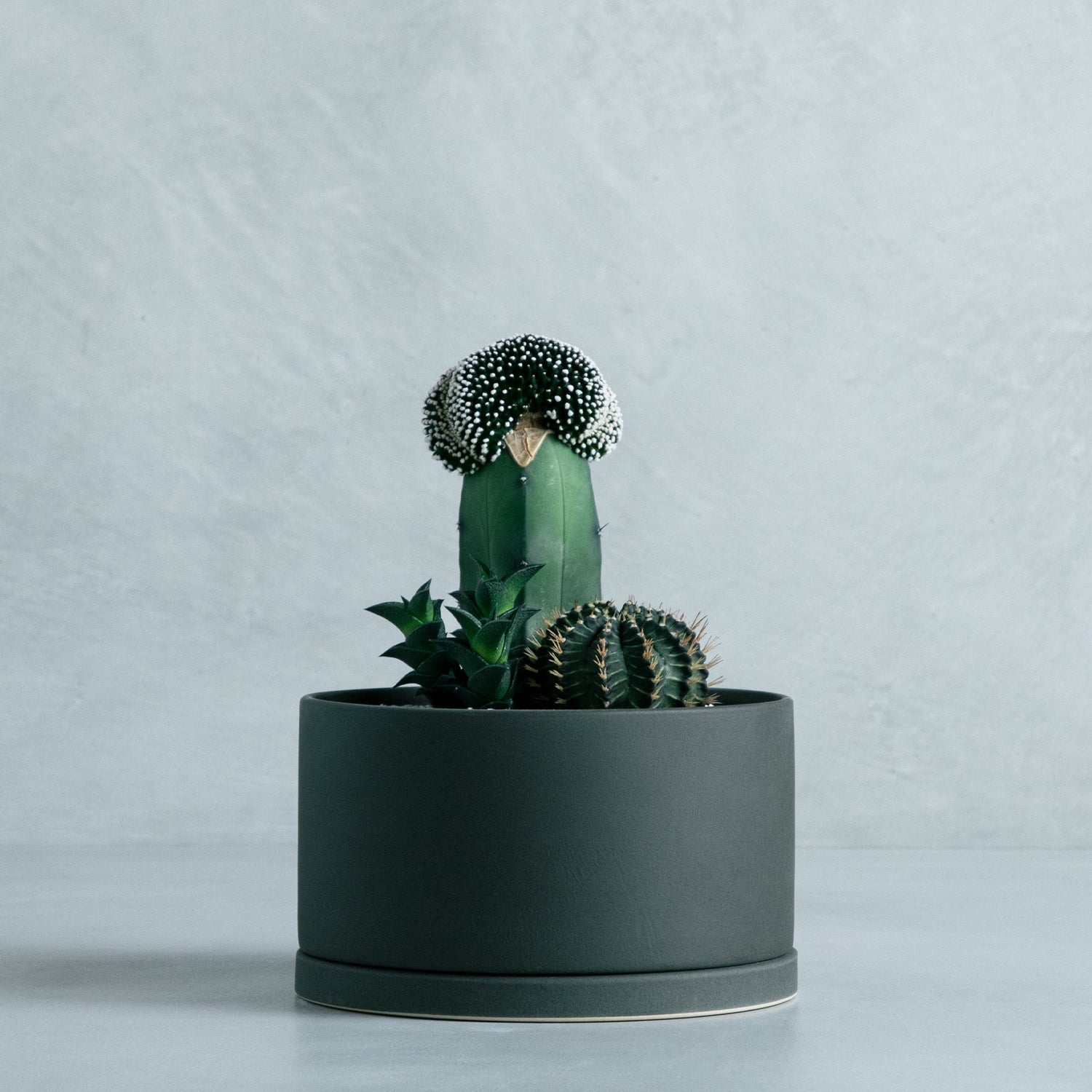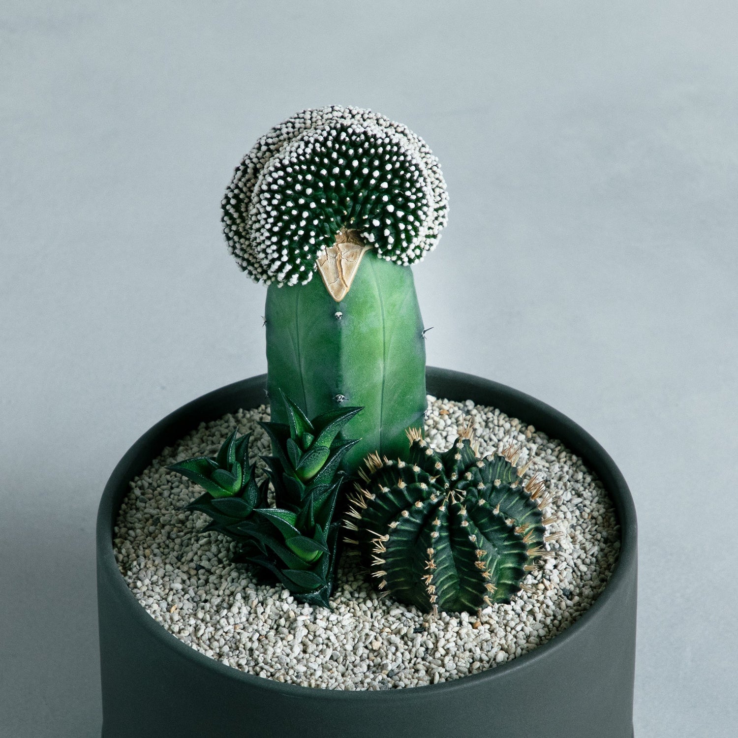 テヌイシマ綴化接ぎ木、ハオルチアビスコーサ、牡丹玉の黒が美しい多肉植物とサボテンの寄せ植え。植物の高低差とバランスを意識して仕立てました。育てやすさを考慮し、置き場所や水やり頻度が近い植物同士を組み合わせています。直射日光の当たらない風通しの良い場所で管理し、土がしっかり乾いてからたっぷりと水を与えましょう。