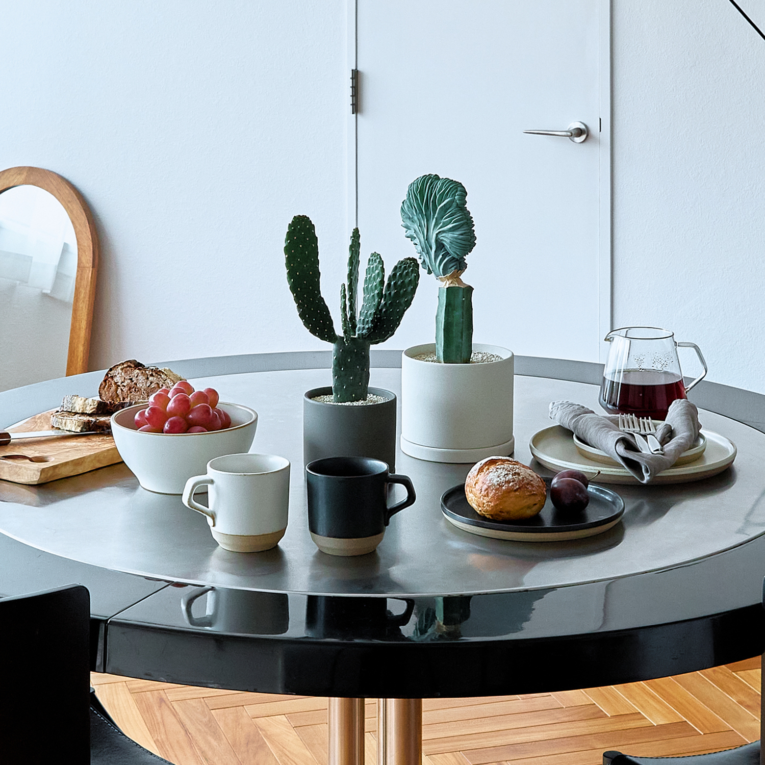 バンザイをしているようなシルエットが愛らしいサボテン。しっかり日光に当たると、表面が味わいのある黒みがかった色になり、切り口から扁平な子株が伸びていく変化を愉しむことができます。子株はとれやすいのでご注意ください。