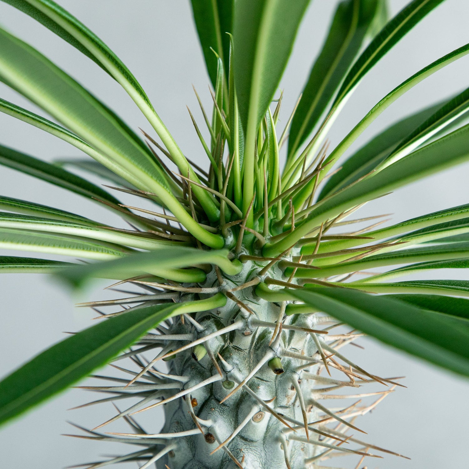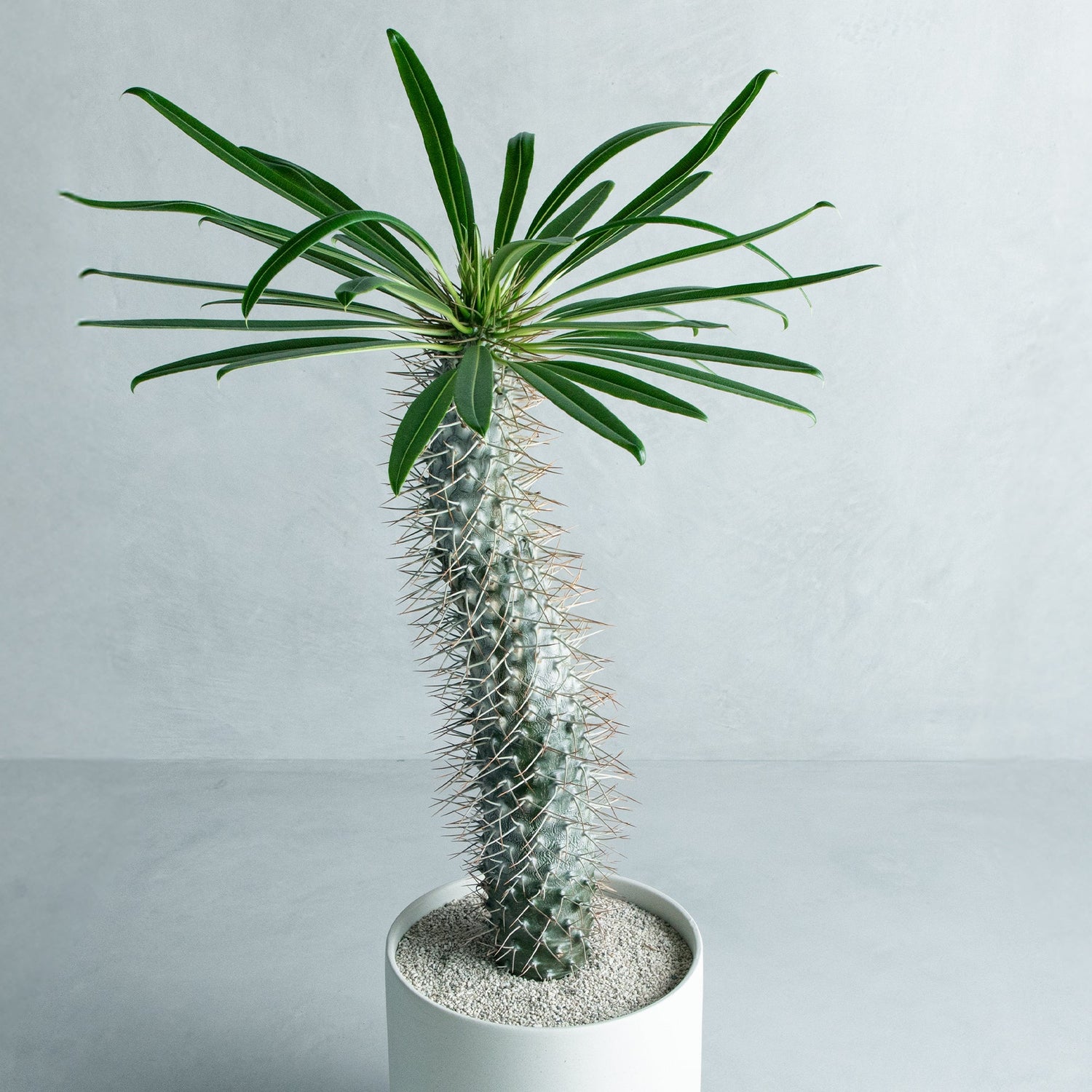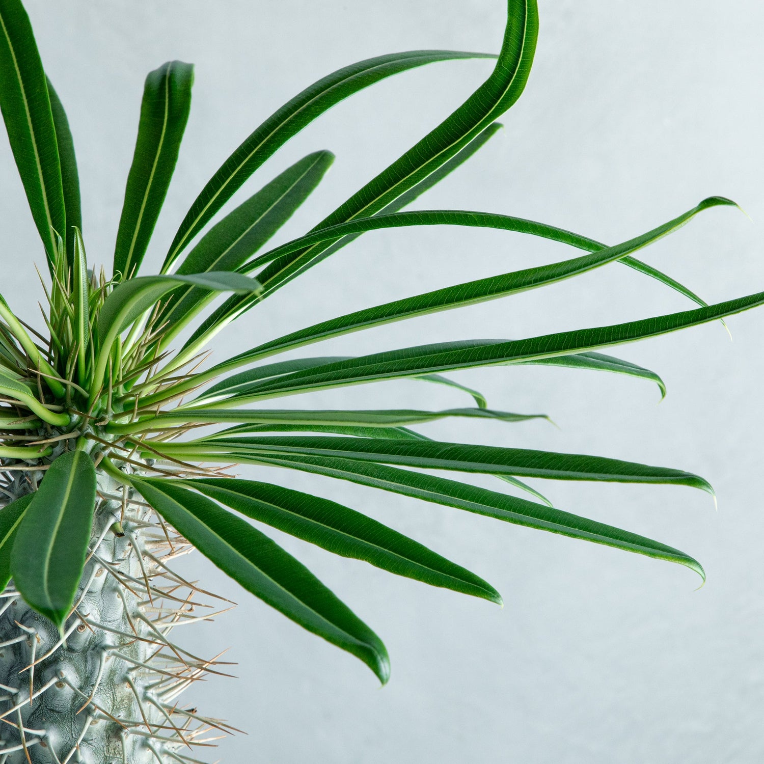 太い幹に鋭い刺を纏い、頭頂部に葉が生い茂るユニークな姿の塊根植物。大きく生長するに従い徐々に刺が抜けていきます。日光を好むため、年間を通して陽当たりの良い場所で管理しましょう。冬の休眠期には葉が落ちますが、断水し根腐れを防ぐことで、春にはまた新しい葉が生えてきます。